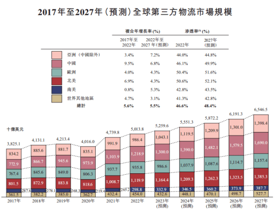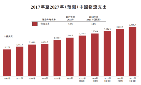 根据弗若斯特沙利文报告,中国物流支出总额从2017年的1.8万亿美元增至2022年的2.6万亿美元,复合年增长率为7.7%,预计2027年将进一步增至3.4万亿美元,2022年至2027年的复合年增长率为5.1%。