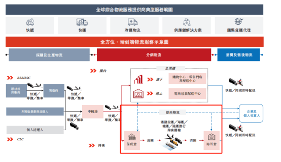 以下是全球综合物流服务商的业务,其中,跨境物流业务的核心就是通过货运机队将货物从国内保税仓运送到海外仓,再由海外仓进行下一步货运。