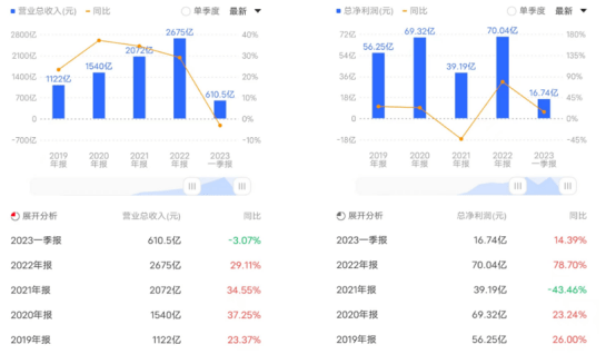 2021年和2022年同比增幅分别为34.5%和29.1%。今年一季度实现营收610.48亿元,同比下降3%。净利润分别为64.16亿元、43.82亿元和70.57亿元,2021年同比降幅为31.7%,2022年同比增幅为61%。今年一季度净利润为16.74亿元,同比增长13.3%。