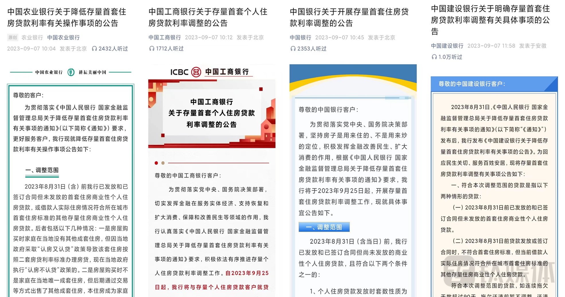 9月7日,农行、工行、中行、建设银行四家银行相继发布关于存量首套个人住房贷款利率调整的公告,明确存量个人住房贷款利率调整的条件和规则。
