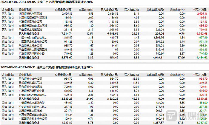 实际上,在公司这一波行情中,量化资金频繁出现在龙虎榜上。8月30日-8月31日,9月4日-9月5日,公司因涨跌幅偏离值累计达20%而二度披露龙虎榜。榜单显示,量化在砸,游资在接。
