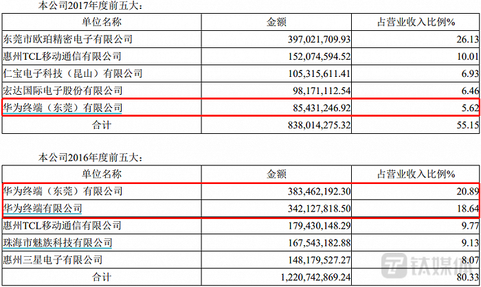 不过,自公司2017年上市之后,与华为的合作便急转直下,早于华为被制裁的2019年。2017年年报显示,华为终端(东莞)有限公司在公司前五大客户排名中由第一位降至第五位,营收金额从3.83亿元降至只有0.85亿元,营收占比从超过20%降至5.62%。同时另一家华为合作方——华为终端有限公司已被挤出前五名单,具体合作金额已无从知晓。