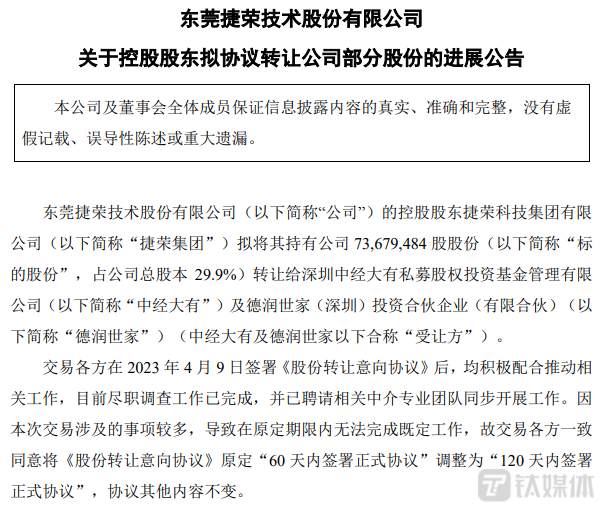 4月10日,公司控股股东捷荣科技集团有限公司(下称捷荣集团)与受让方深圳中经大有私募股权投资基金管理有限公司(下称中经大有)及德润世家(深圳)投资合伙企业(有限合伙)(下称德润世有)签署了《股份转让意向协议》。