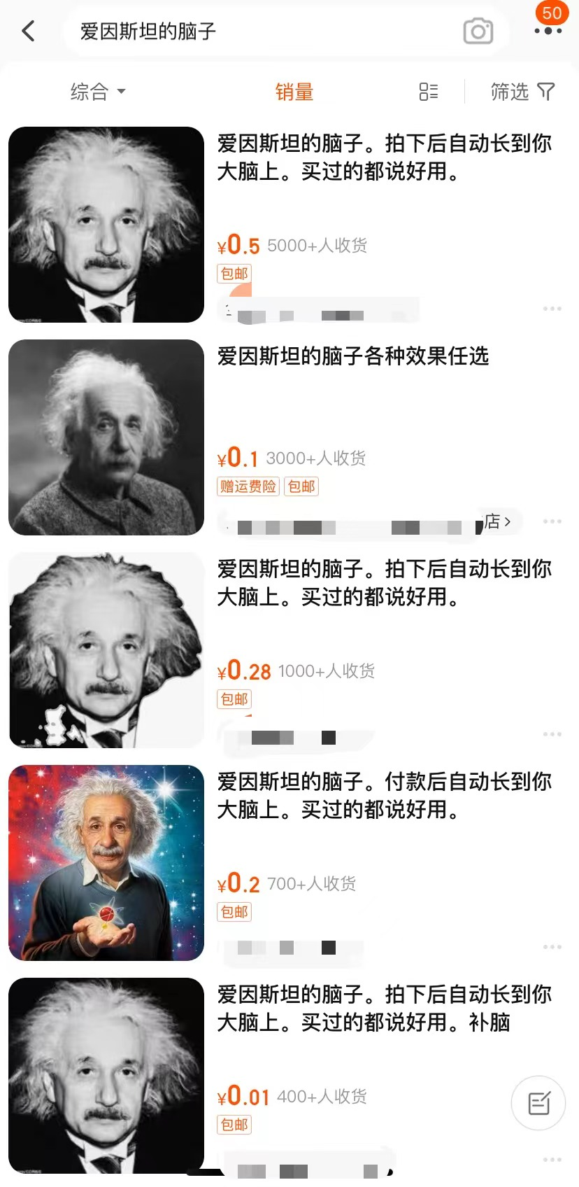 花五毛钱就可以拥有一份“爱因斯坦的脑子”,听上去惊悚又无厘头,但正在真实世界上演。在淘宝,已经有上万买家尝试了这种新奇的体验,也许有人会理性的分析这只是一种噱头和营销,对于卖家来说更是无本万利,但是买家并不在意——你以为我在交智商税,其实是你不懂我们的幽默。