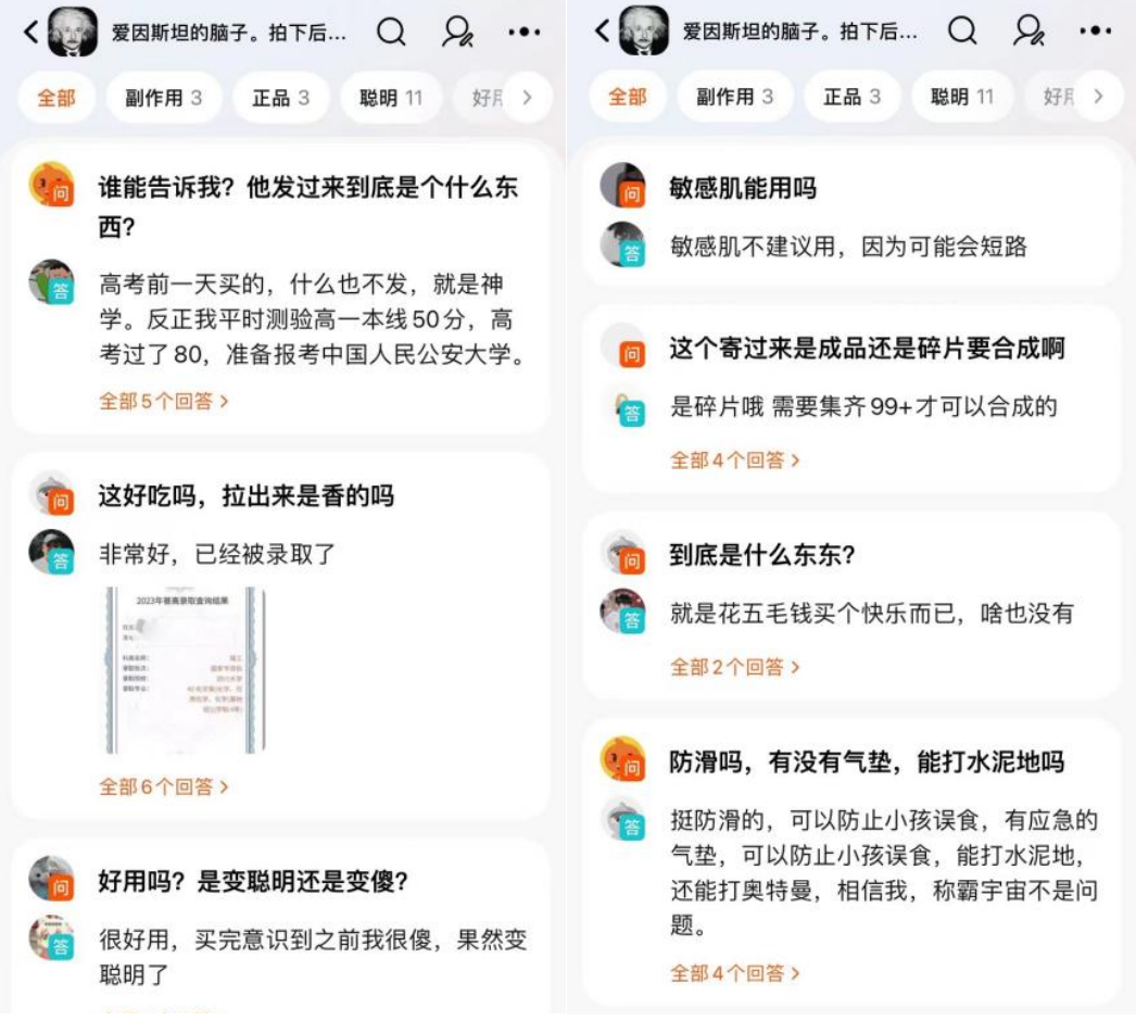 在淘宝搜索“爱因斯坦的脑子”,已经有上万人确认收货,在小红书也有不少用户晒出了自己买脑子的订单,并表示非常有效,有的用户还在不同卖家那里分别购买不同的脑子进行测评,看看哪家的更好。有的卖家则对“爱因斯坦的脑子”再进行细分,包括聪明脑、恋爱脑、搞钱脑、文科脑、理科脑、艺术脑、社交脑等不同品类,价格上还会有微小的差异,“买啥补啥,买完就长脑”。