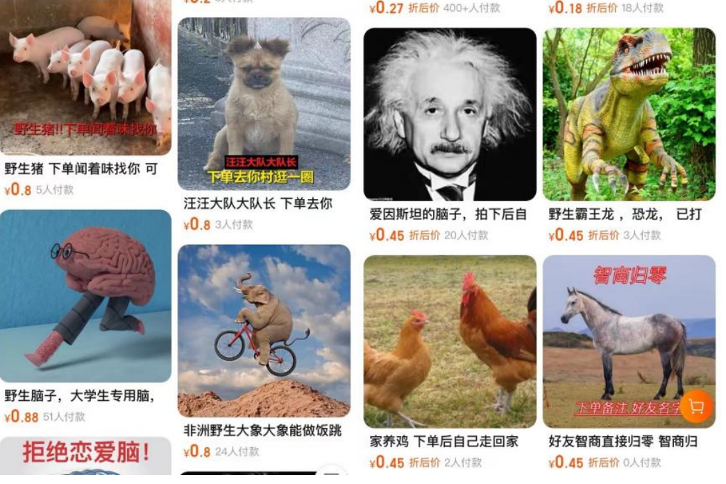 如果说买“爱因斯坦的脑子”还有一点“求好运”的玄学成分在,一些其他类型的虚拟商品则完全是为了恶搞和好玩,如电子蚊子(下单后自动去叮你想叮的人)、野生猪(以及鸡、狗、大象、霸王龙,已打疫苗,下单后自己走去你家找你)、好友智商归零(下单要备注好友名字)等,即使真的有人被好友买了“智商归零”也不会真的生气,真的好友都能理解这种无厘头的幽默。