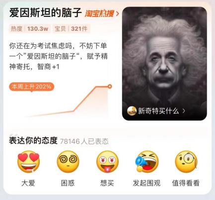 作为人类最伟大的物理学家之一、聪明得像个穿越者一样的爱因斯坦,肯定不会预见到,若干年后他的大脑会在遥远东方一个叫“淘宝”的购物平台上火热售卖,每份均价5毛钱。在真假难辨的爱因斯坦名言中有一句:“想象比知识更重要,你的头脑是你最有用的资产”,没想到“想象”和“头脑”被中国的年轻人以这样一种轻松幽默的方式呈现出来。
