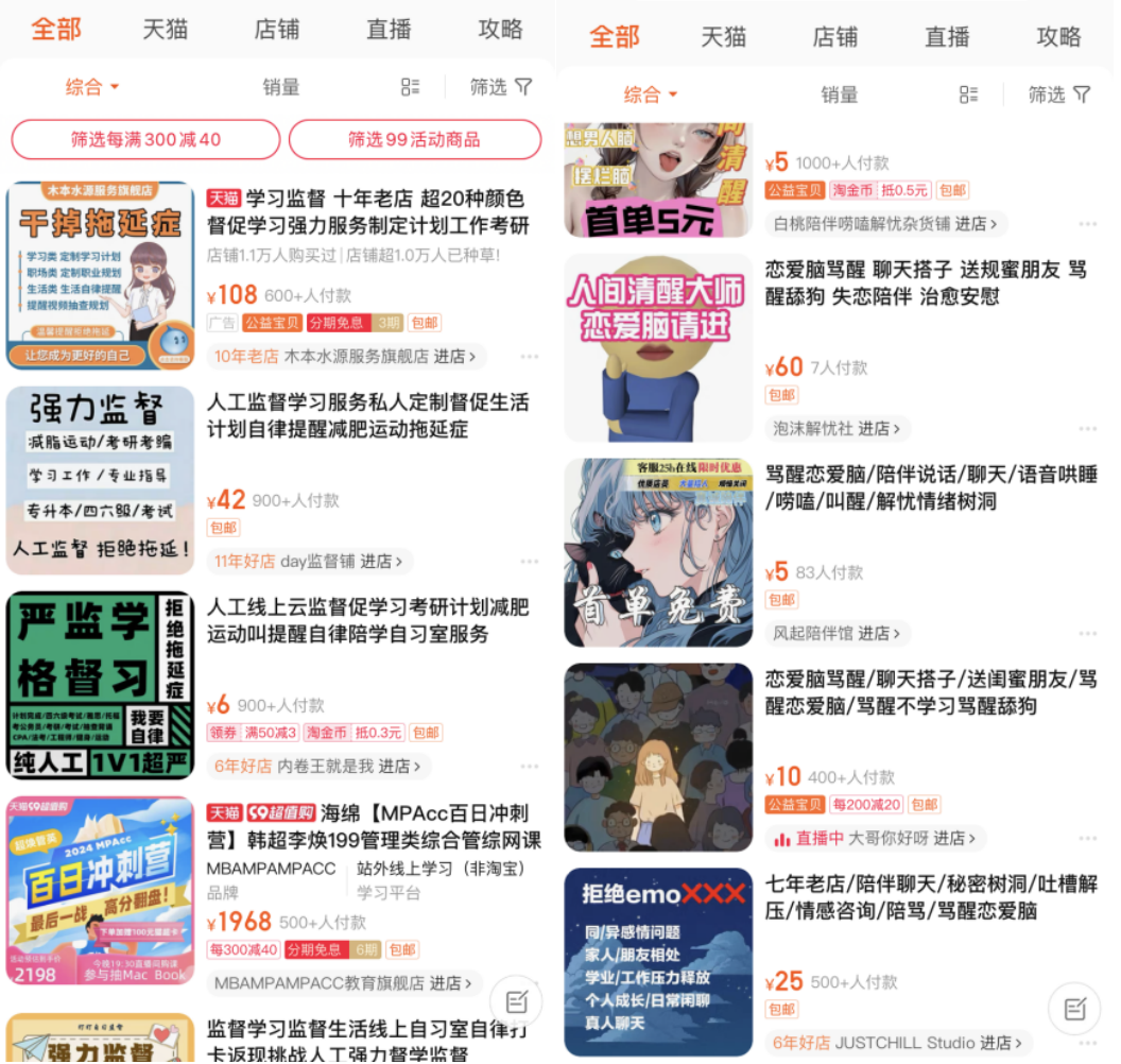 除此之外,还有不少聊天搭子、骂醒恋爱脑、秘密树洞、云监督学习的虚拟产品也在淘宝、闲鱼等电商平台卖的十分火热。在一个树洞聊天的评论区,不少买家表示,自己压力很大但是身边人又不理解,跟树洞聊天之后舒服多了,虽然给自己带来压力的事情不会因为聊天而消失,但自己心情好多了,面对困难的勇气也增加了。在一个云监督学习的评论区,大多数买家都表示在客服的“炼狱监督、魔鬼监督”下,自己放下了手机、专心学习,每天的打卡和反馈也让自己的学习计划规律了不少。