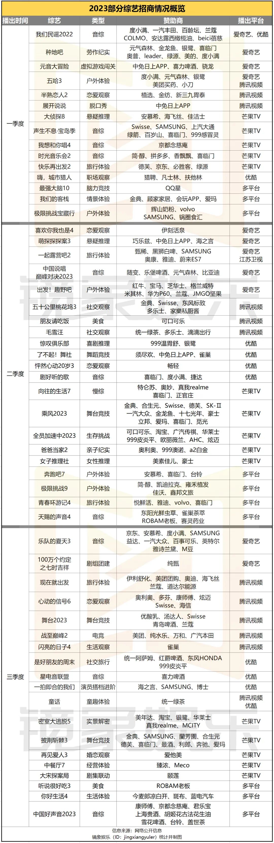 2023年至今,综艺招商终于支棱起来了。尤其是随着“浪姐”、“披哥”、《乐队的夏天》等强势内容回归,综艺市场也迎来更多品牌合作。