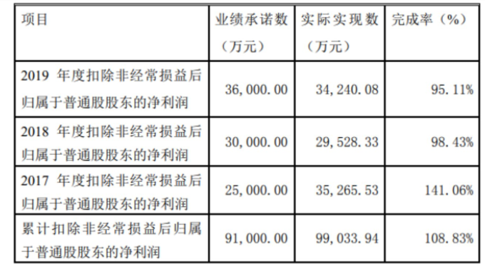 润星科技原股东承诺,在2017年至2019年度,润星科技的扣非后净利润分别为不低于2.5亿元、3亿元和3.6亿元,三年累计金额为9.1亿元。