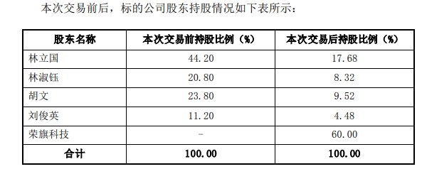 根据披露公告显示,荣旗科技与宁德中能及其股东签署了《收购意向协议》,拟以现金方式收购宁德中能4名自然人股东林立国、林淑钰、胡文和刘俊英合计持有的60%股权。交易完成后,荣旗科技取得控股权,并将宁德中能及其子公司纳入合并报表范围。