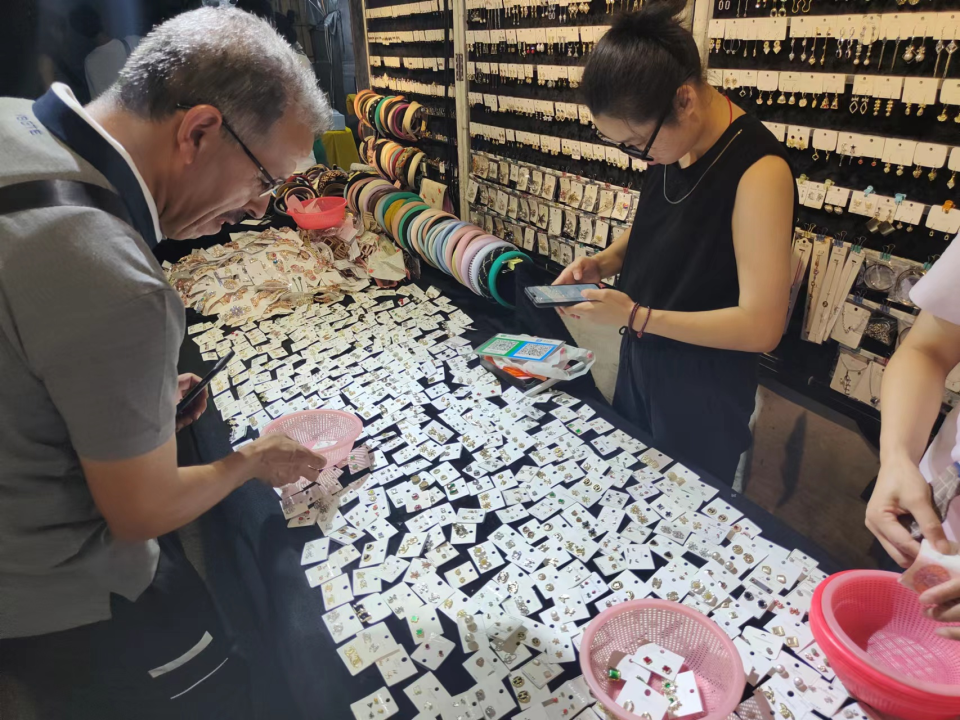 法国商人Star和其伊拉克友人驻足杨美丽(化名)的摊位前,打算买些耳饰赠与朋友,结账时,他们用中文砍价道:“最低最低?再便宜些!”杨美丽则用英文斩钉截铁地回复道:“NO!1 piece 15.(不行,一副十五。)”