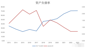 此外,钛媒体APP还发现公司资产负债在逐步升高。2017年之后,公司的资产负债率就急速攀升,2018年增加近23个百分点达到45.67%。并且资产负债率增长并没有停止,截至2023年6月底,公司的资产负债率已经拉高至70.88%。同时,公司流动比率不断下降,2023年中报降至0.68,短期偿债能力持续削弱。![]()
