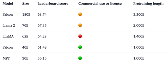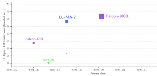 同时,在Hugging Face开源大模型榜单上,Falcon 180B也是当前评分最高(68.74分)的开源大模型,超越了LlaMA 2(67.35)。