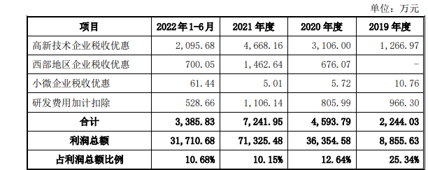 数据显示,2019-2021年,金田新材及子公司享受税收优惠金额为2244.03万元、4593.79万元、7241.95万元,占利润总额的比例分别为25.34%、12.64%、10.15%。