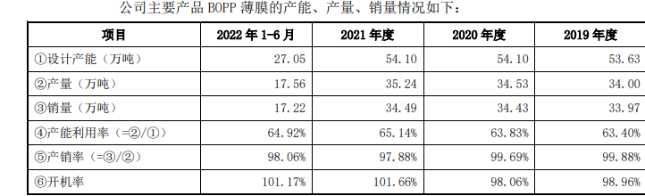 钛媒体APP注意到,2019-2021年以及2022年上半年,金田新材BOPP薄膜的设计产能分别为53.63万吨、54.1万吨、54.1万吨、27.05万吨;各期对应的产量分别为34万吨、34.53万吨、35.24万吨、17.56万吨;产能利用率分别为63.4%、63.83%、65.14%、64.92%,投入产出比并不高。![]()