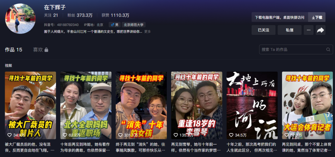 对于“在下辉子”而言,当下正处于涨粉高峰期,如何维持账号长期发展是未来的难题。在以年为单位的创作周期里,也许他会面临着选题枯竭和流量不稳的烦恼,但记录下和老同学相逢的瞬间、畅谈一段人生,似乎就已经完成了账号最初的使命。