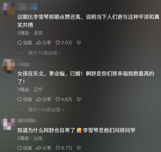 评论区中,有网友表示:“这期比李雪琴那期点赞还高,说明当下人们更与这种平淡和真实共情。”还有人称阿舒是看起来最治愈、过得最幸福的同学。
