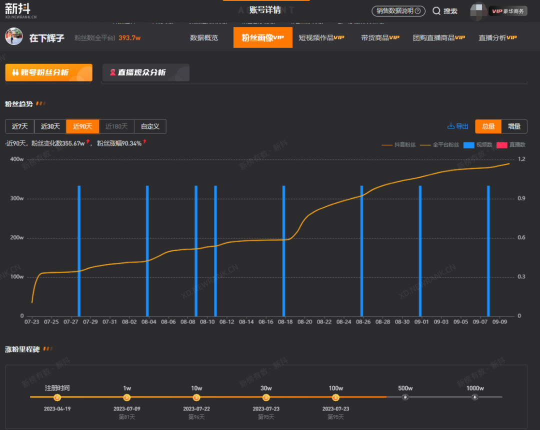 这条获赞200万的视频,也让“在下辉子”迎来了第一个涨粉高峰。新抖数据显示,这条视频发布后,“在下辉子”两天涨粉90万,粉丝量从十万突破百万大关。