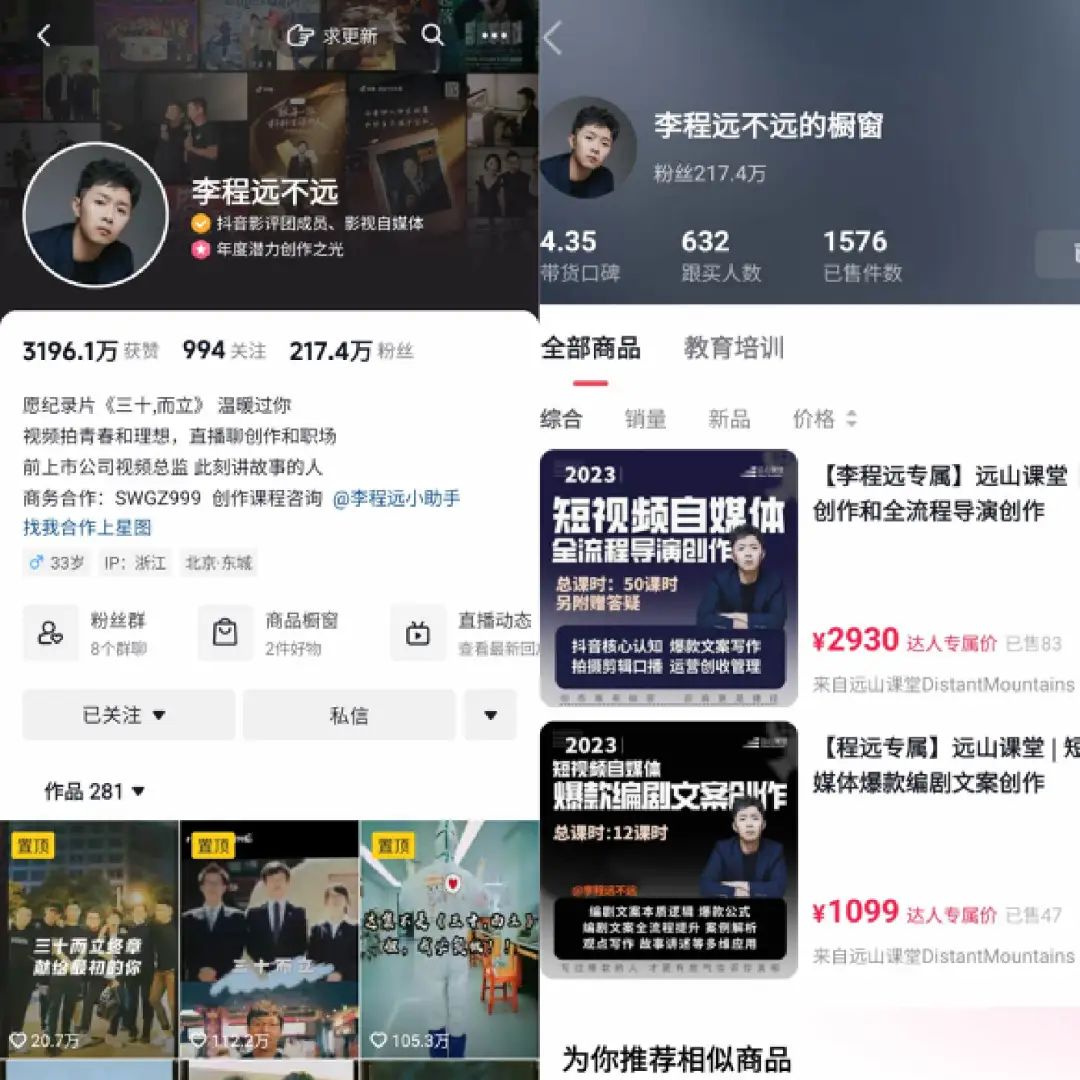 走红后,“李程远不远”还发力知识付费赛道,上线了价格一千元至三千元的自媒体创作课程。