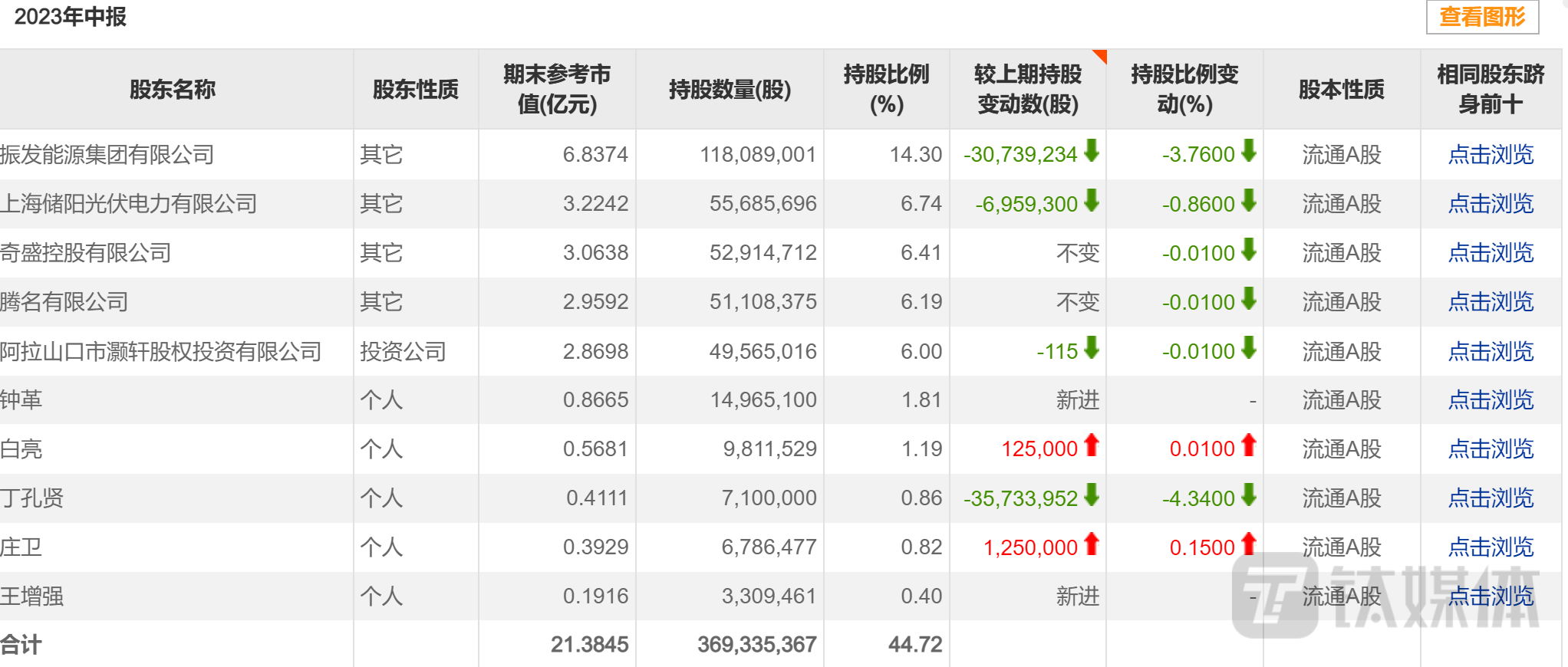 钛媒体APP注意到,振发集团的被动减持已成为常态,据不完全统计,从2020年底至今,公司发布的振发能源被动减持公告就已经达到14条。振发集团的持股数量也从2020年6月底的2.25亿股(占公司总股本的27.35%)一路下滑。