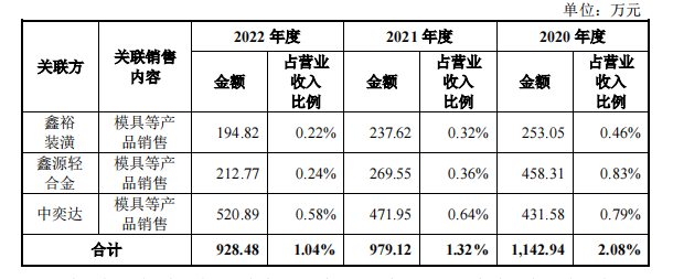 据招股书披露,上述部分公司与江顺科技存在关联交易。报告期内,江顺科技向鑫源轻合金、鑫裕装潢、中奕达的销售金额合计分别为1142.94万元、979.12万元、928.48万元。