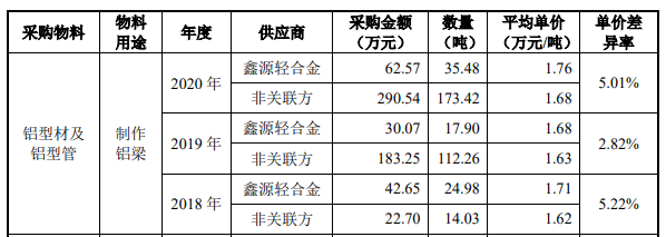 但钛媒体APP翻阅首次IPO招股书发现,江顺科技对鑫源轻合金(鑫源轻合金、鑫裕装潢合称)的采购单价均高于非关联方。以铝型材及铝型管为例,2018年至2020年平均单价分别较非关联方高出0.09万元/吨、0.05万元/吨、0.09万元/吨。