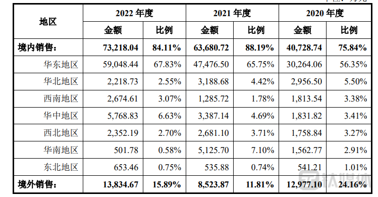 分区域来看,江顺科技收入主要集中在华东地区,其收入占比分别为56.35%、65.75%、67.83%,呈不断集中趋势。其次为境外收入,收入占比分别为24.16%、11.81%、15.89%。各期境内其他区域收入占比较低,最高是华中地区(2022年6.63%)。