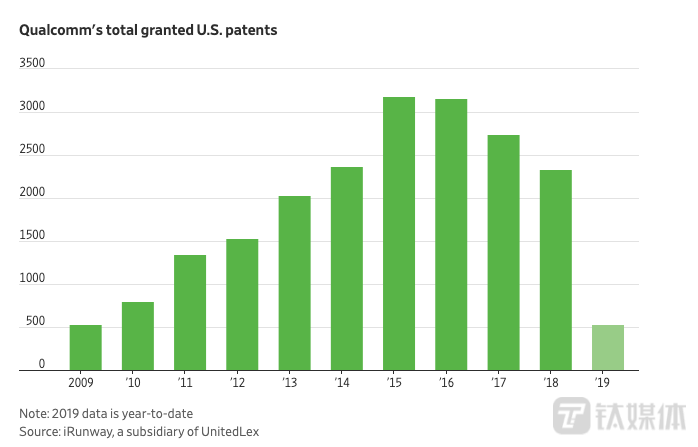 根据iRunway数据,截至2019年,高通在美国建立了大量与手机、3G/4G/5G网络相关的专利组合,并表示其在全球拥有超过 13万项专利和专利申请。其中在2015年、2016年,专利数量总计超过6300项左右。
