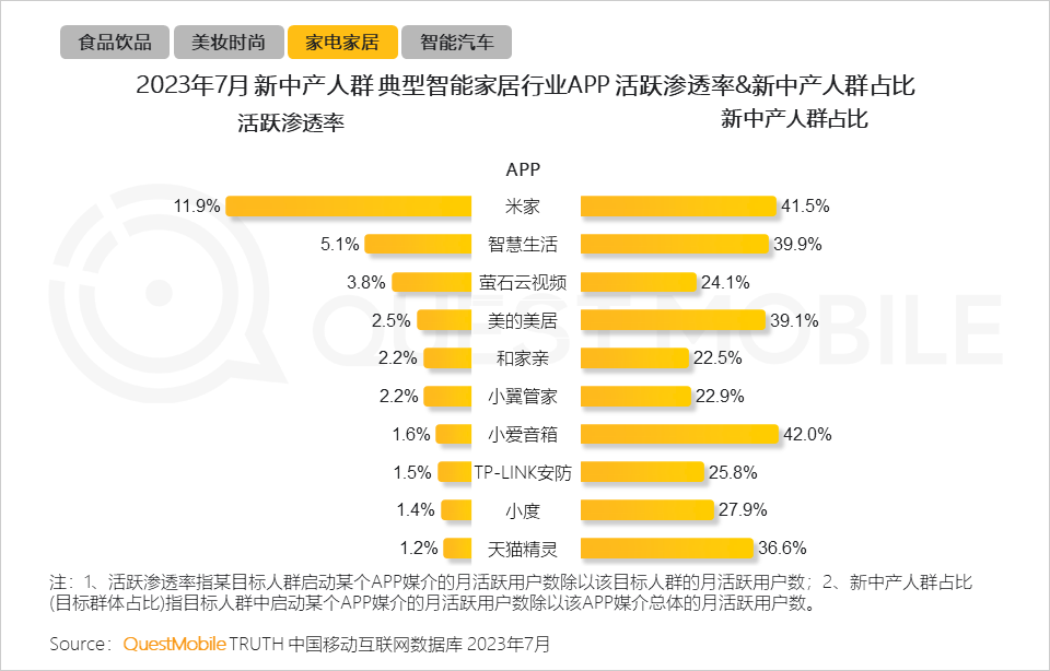 9、新中产对家电“做加法”:物联网时代,智能家电陆续实现智能管理、远程控制,新中产人群更愿意选购支持联网的家居产品,进而表现为物联网相关的智能家居类APP贡献主要流量