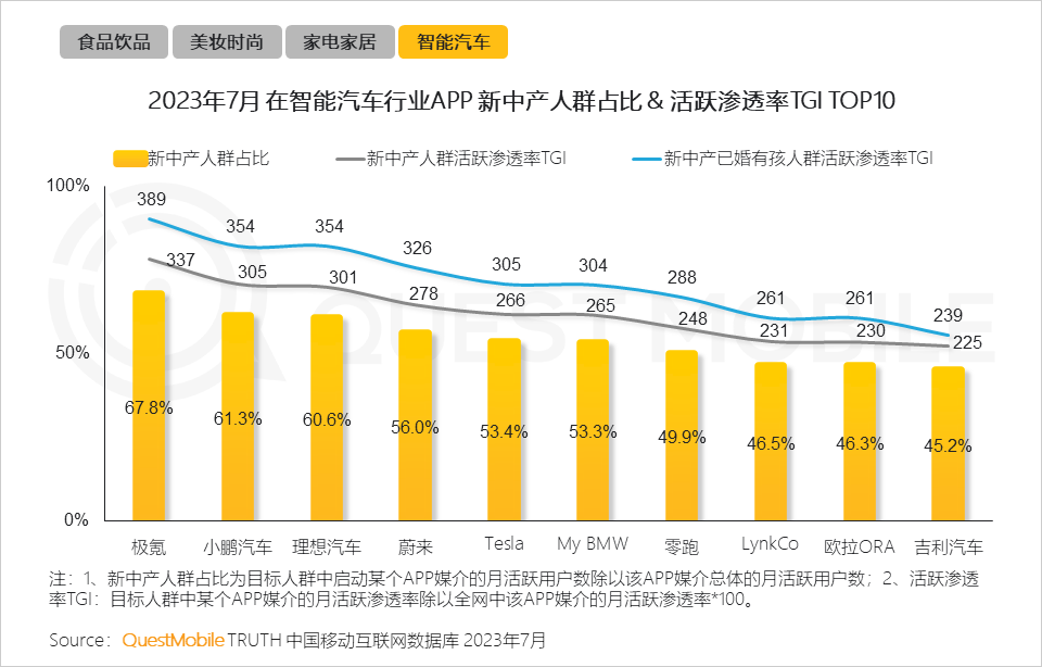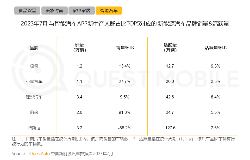 QuestMobile数据显示,2023年7月,新中产人群占比TOP5智能汽车APP所对应的新能源汽车品牌销量和活跃量整体实现环比增长。