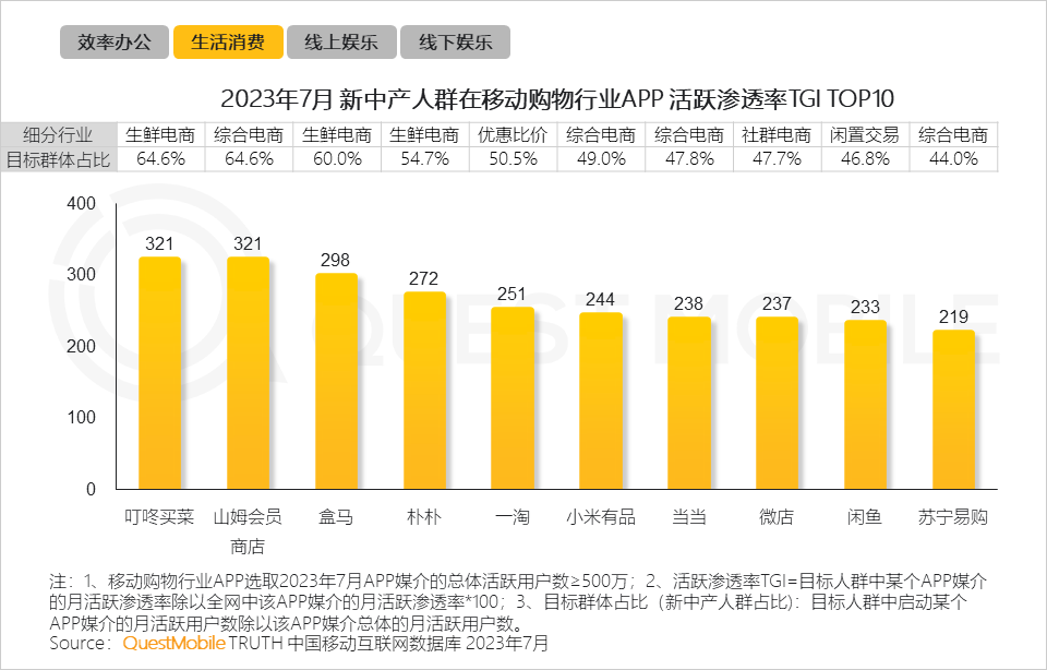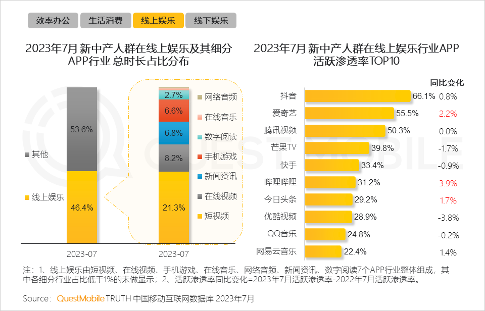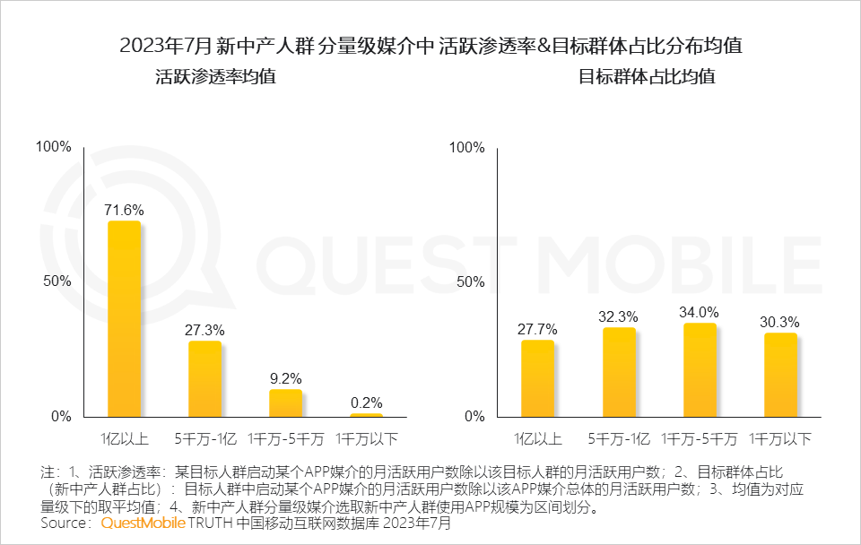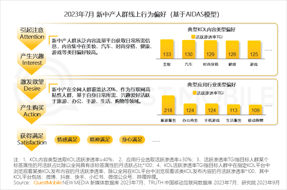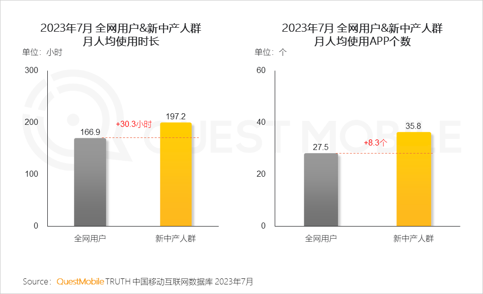 QuestMobile数据显示,2023年7月,新中产月人均使用时长超出全网用户30个小时;随着数字化渗透加深,新中产人群需使用更多的APP来满足自身的办公、娱乐、购物等需求,进而表现出相比全网平均水平多使用8个APP。