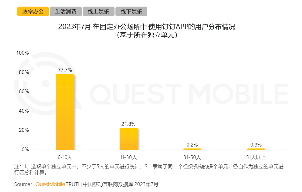 3、钉钉APP作为集商务办公、OA审批、考勤打卡、视频会议一体的效率办公应用,来自固定场所的办公用户,所属独立单元多为6-10人