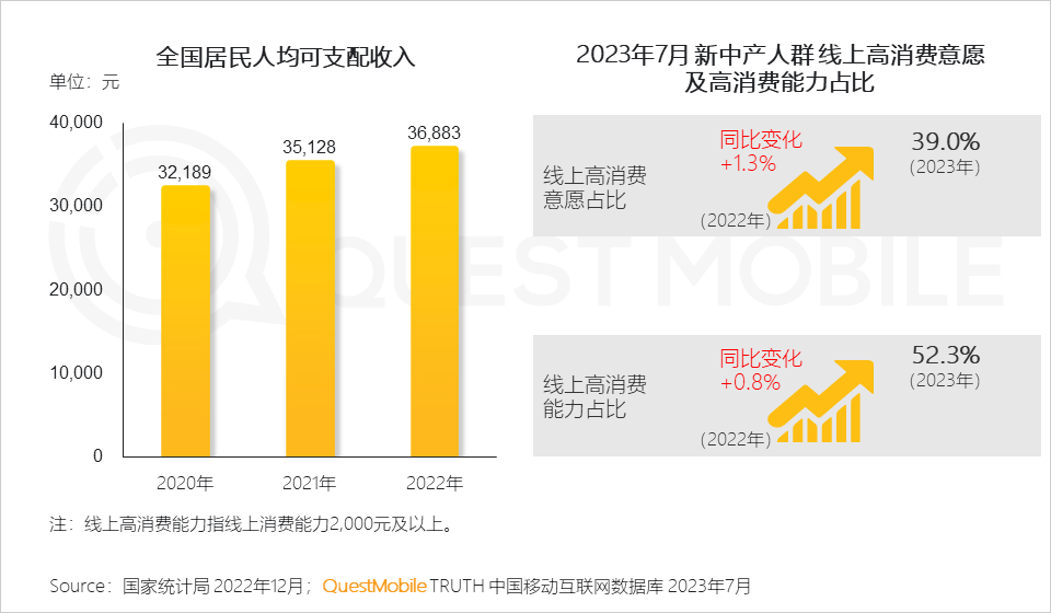 1、随着社会经济的发展,新中产人群活跃用户规模2.45亿,同比增长6.4%,在全网中占比提升至20%