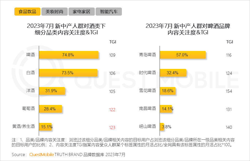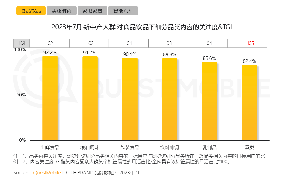 QuestMobile数据显示,相较全网用户,新中产人群对葡萄酒、黄酒/养生酒具有较高关注度。
