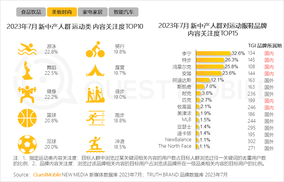 7、新中产人群通过多样化的运动,调节身心健康、释放精神压力;装备上,李宁、特步、鸿星尔克、安踏等国产运动品牌是关注的重点