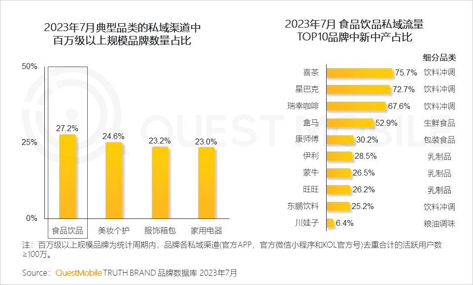 4、私域软广营销方面,典型消费品类通过持续的私域运营,已有超20%的品牌拥有百万以上的自建私域流量,其中在食品饮品私域流量中,新中产人群在热销饮料、咖啡类饮品覆盖更广
