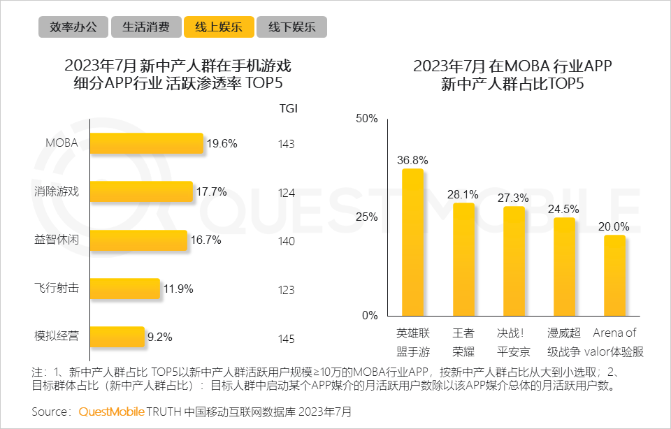 9、新中产人群在MOBA、消除游戏、益智休闲类游戏方面的活跃渗透率较高;新中产主要选择《英雄联盟》《王者荣耀》《决战!平安京》等头部游戏以获得线上竞技、团队合作的娱乐体验