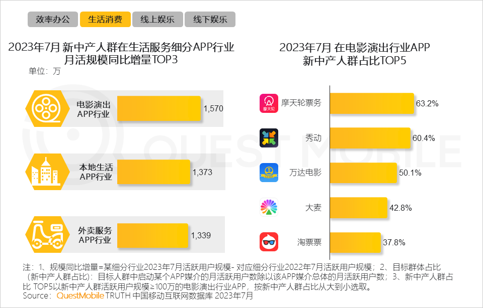 QuestMobile数据显示,摩天轮票务、秀动和万达电影APP中新中产人群占比超过五成, 即新中产人群经常使用以上应用进行电影演出票务的购买。