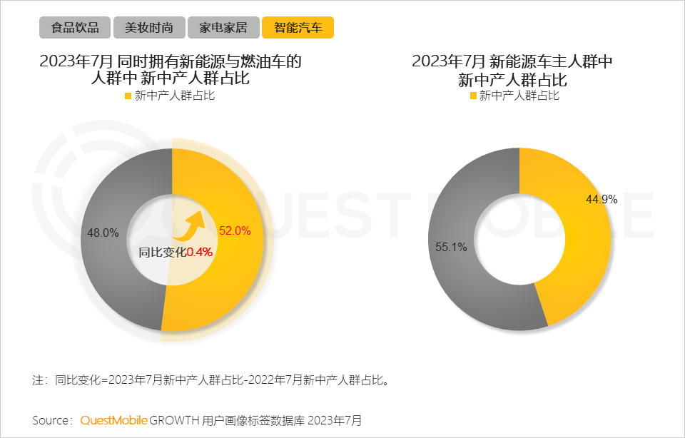 11、汽车作为个人或家庭的大宗消费,越来越多新中产人群开始接受新能源汽车,“一油一电”成新标配;新能源汽车在新中产人群中的普及率超四成