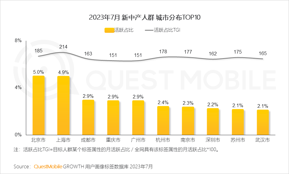 QuestMobile数据显示,随着经济的发展,截止到2023年7月,25-40岁之间、身处三线及以上城市、线上消费能力1,000元及以上、线上消费意愿为中、高的新中产人群规模已经达到2.45亿,同比增长超过6%;年龄分布上,90后已经超过80后成为主力,城市分布上,北京、上海、成都、重庆、广州位居前五,分别占比5%、4.9%、2.9%、2.9%、2.9%。