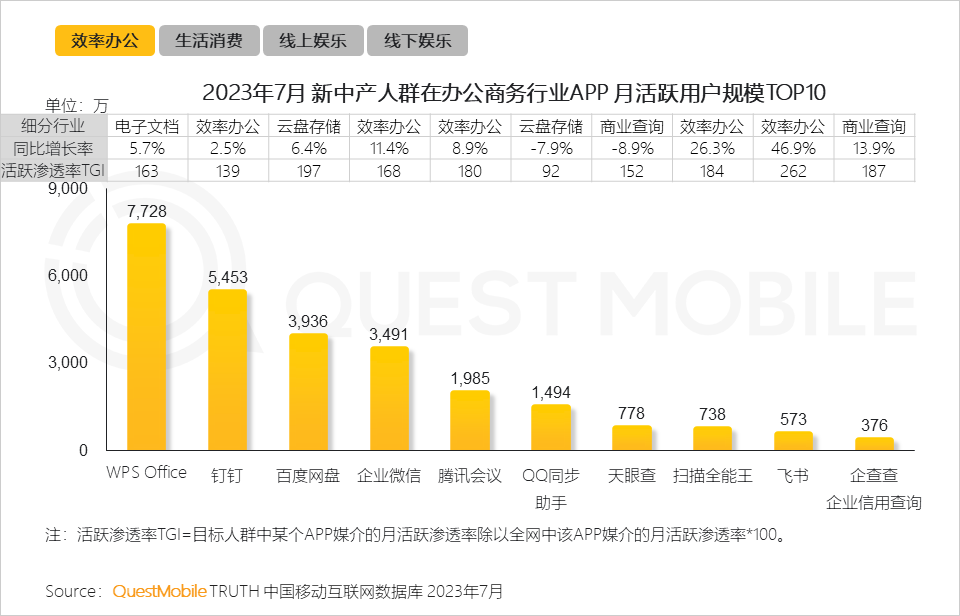 QuestMobile数据显示,钉钉、企业微信、飞书APP三大典型集企业协作与管理的APP均实现同比规模增长。