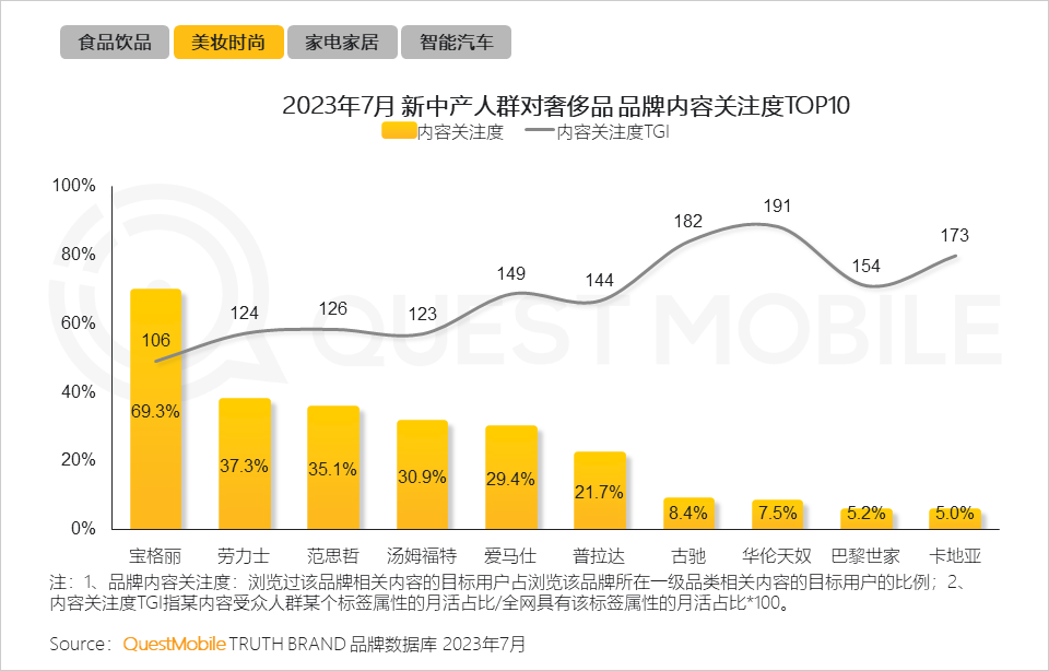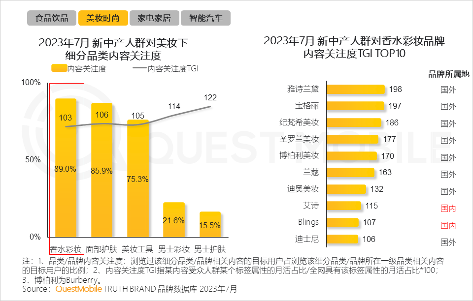 QuestMobile数据显示,与全网相比,新中产人群对于男士彩妆、男士护肤的倾向也越发显著,内容关注度TGI均大于110。