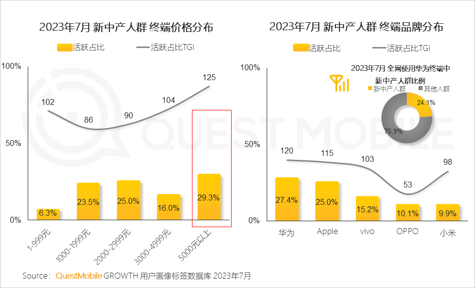 6、近三成新中产人群使用价格在5,000元以上的高端手机;新中产是华为手机的重要人群,占据着华为手机在全网超二成的终端用户