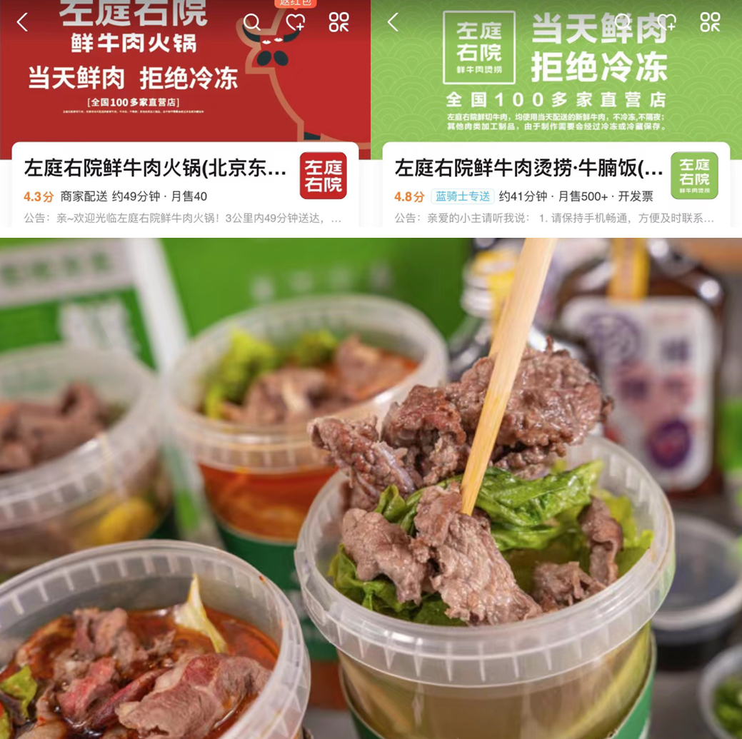 主打鲜牛肉火锅的左亭右院,除了火锅外卖外,还开出了烫捞·牛腩饭。子品牌以绿色为主调,与主品牌的红色形成明显区分,但均强调了“鲜牛肉”这一共同卖点。