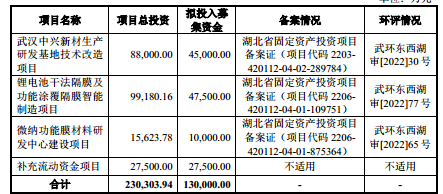 与此同时,上述10亿元的资金缺口主要是来自武汉中兴新材生产研发基地技术改造项目、锂电池干法隔膜及功能涂覆隔膜智能制造项目、微纳功能膜材料研发中心建设项目,同时,上述项目的环评批复均来自2022年。