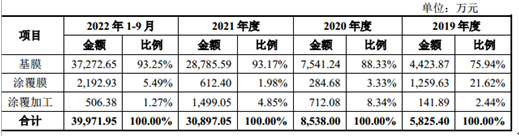 从产品上看,中兴新材主要拥有基膜、涂覆膜、涂覆加工等3大产品,其中基膜产生的销售收入分别为4423.87万元、7541.24万元、28785.59万元、37272.65万元,分别占当期主营业务收入的75.94%、88.33%、93.17%、93.25%,基膜始终为中兴新材的第一大产品。