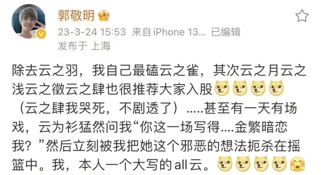 但观众依然能从《云之羽》的故事中窥见熟悉的影子:金靖的角色是类唐宛如的郭式喜剧角色,男二宫尚角和弟弟宫远徵感情深厚,能让观众嗑起骨科CP,甚至男主所在的家族都姓宫,这个姓氏在《小时代》里是权力和金钱顶端的象征,重要男配宫洺被广泛认为是郭敬明本人的理想具现化。