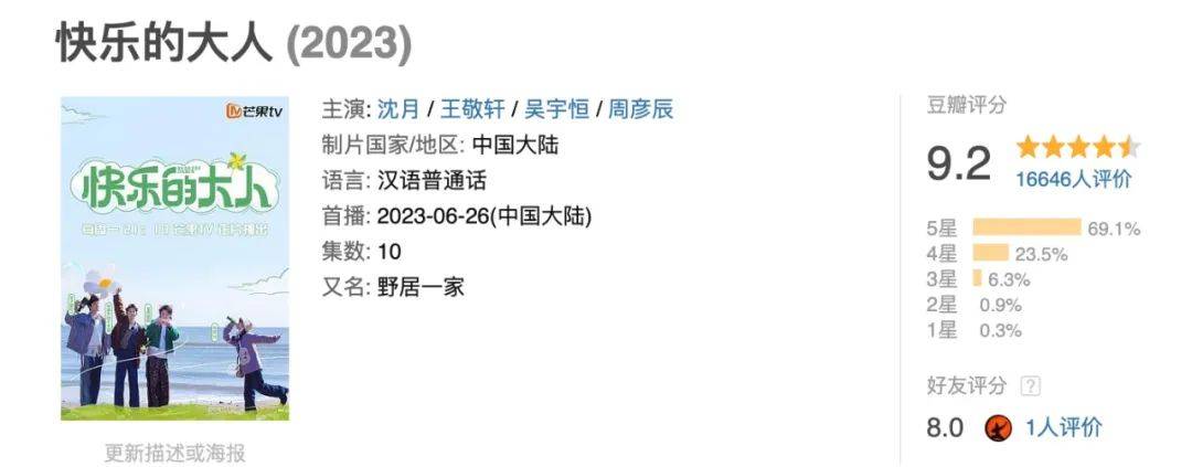 二来,芒果剧衍综的服务对象面向不同体量剧集,合作模式也千差万别。比如最近在豆瓣拿到9.2高分的口碑小神综《快乐的大人》,它的卡司都来自于因拍摄爱奇艺网剧《开画!少女漫》而彼此熟悉的沈月、王敬轩、吴宇恒、周彦辰,换言之,它走的是与《欢迎来到蘑菇屋》一挂的熟人局团综路线。