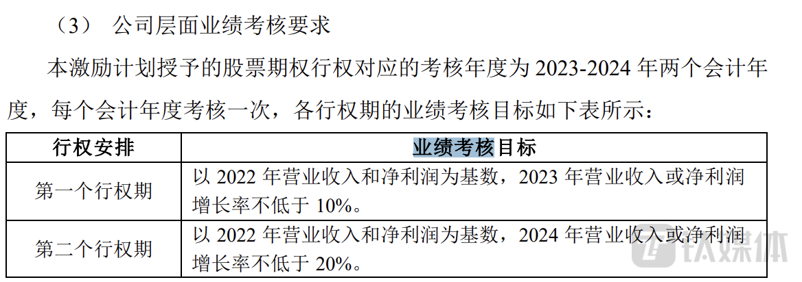 股票期权激励计划与限制性股票激励计划的考核指标要求一致,考核年度为2023年-2024年会计年度,以2022年营收和扣非净利润为基数,要求2023年营收或扣非净利润增长率不低于10%、2024年营收或扣非净利润增长率不低于20%。